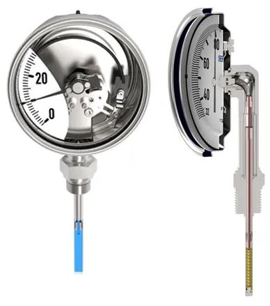 双金属温度计的常见量程为-70 °C至+600 °C,且只适用于不充液的仪表。当生产过程中出现震动时,操作员须将其替换成充液温度计,硅油可用来减震。但这一过程中能达到的最高温度限值仅为+250 °C。